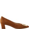 Dámské lodičky Högl s čtvercovou špicí a blokovým podpatkem. Obuv je vyrobena z jemné broušené koziny. V přední části se nachází zlatá kovová spona ve tvaru obdélníku. Výška blokového podpatku je 45 mm.