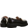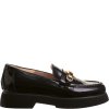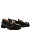 Dámské mokasíny Högl na vysoké platformě. Obuv je vyrobena z jemné telecí kůže s lakovaným povrchem. V přední části v oblasti nártu se nachází zlatá kovová spona ve tvaru loga značky. Výška platformy v patě je 40 mm.