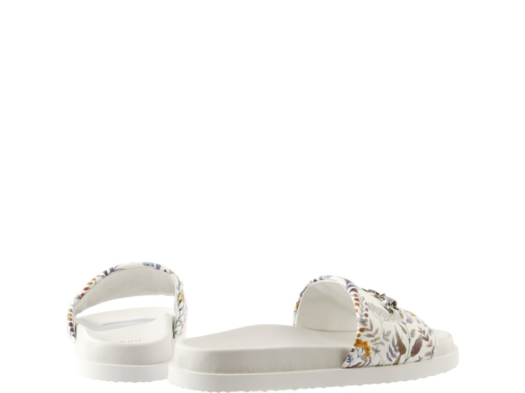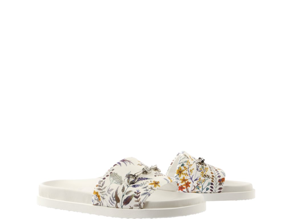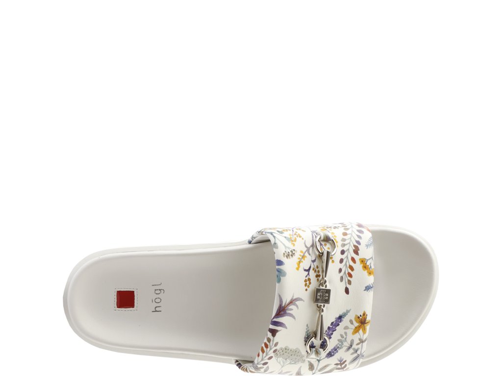 Exkluzivní a super pohodlné vylepšení šatníku: široký pásek našich bílých pantoflí „Kiki“ zdobí potisk květů od firmy Högl. Materiál je vyroben z vysoce kvalitní nappa kůže a díky dodatečnému polstrování je obzvláště pohodlný. Stříbrné přezky s koňskými přezkami dodávají ležérnímu stylu další ženský nádech. Tyto pantofle jsou spolehlivým a pohodlným letním kouskem; nazouvejte je během několika sekund a cítíte se pohodlně – ať už máte na sobě ženské šaty nebo ležérní džíny.