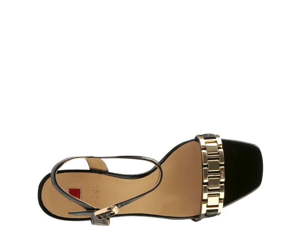 Dámské sandálky Högl na podpatku jehlového typu. Obuv je vyrobena z jemné hladké kůže s vysoce leštěným povrchem. V přední části se nachází zlatá spona, v oblasti kolem kotníku se nachází řemínek s nastavitelnou délkou. Obuv je velmi elegantní a díky jehlovému podpatku s širší základnou je také velmi pohodlná. Je ideálním doplňkem k ležérnímu business looku, ale skvěle se hodí i na nejrůznější večerní akce. Výška podpatku je 80 mm.