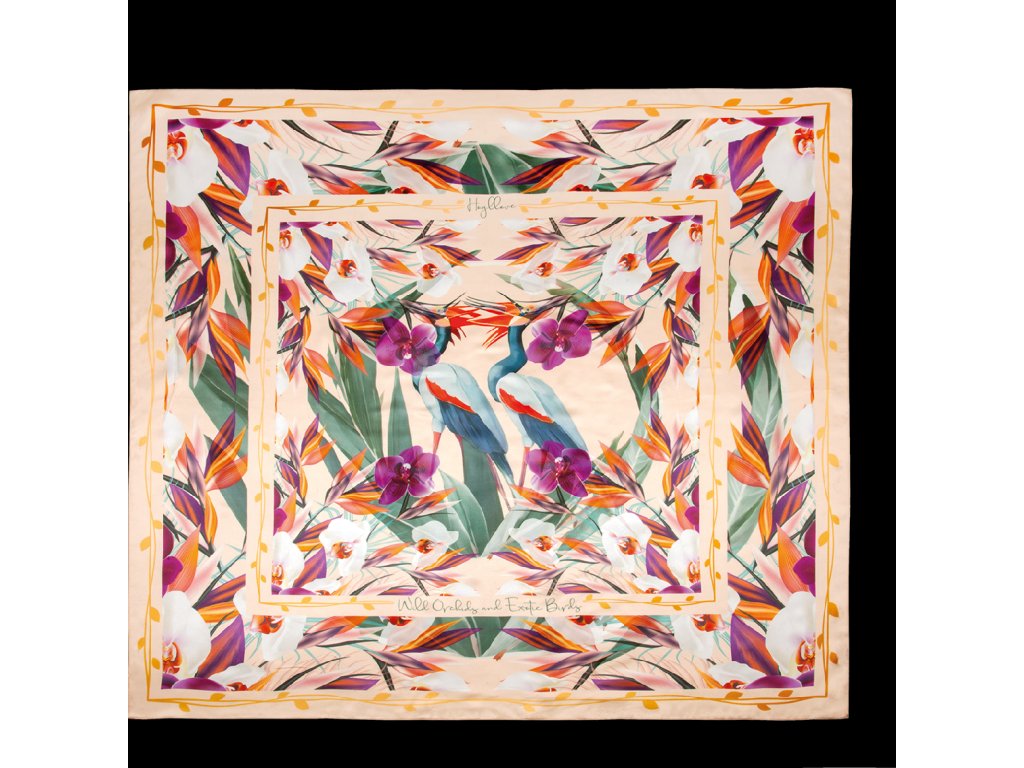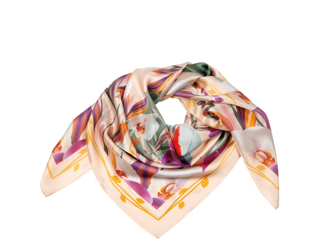 Exotická směs barevných květin a tvarů vynikne na světlém pozadí našeho hedvábného šátku „Karree Exotic Bird“. Dva rajky uprostřed vzoru jsou jeho nejpoutavějším prvkem. Tento šátek zaujme nejen fascinujícím designem, ale i materiál je působivý. Tento šátek Högl je vyroben z čistého hedvábí a v sobě spojuje eleganci s pohodlím a tím jedinečným prvkem. Je to okouzlující a svěží doplněk na cestách, ve větrných jarních dnech nebo jako šátek na hlavu v létě. Obzvláště krásně vypadá v kombinaci s intenzivní fialovou barvou naší psaníčkové kabelky „Doreen“.